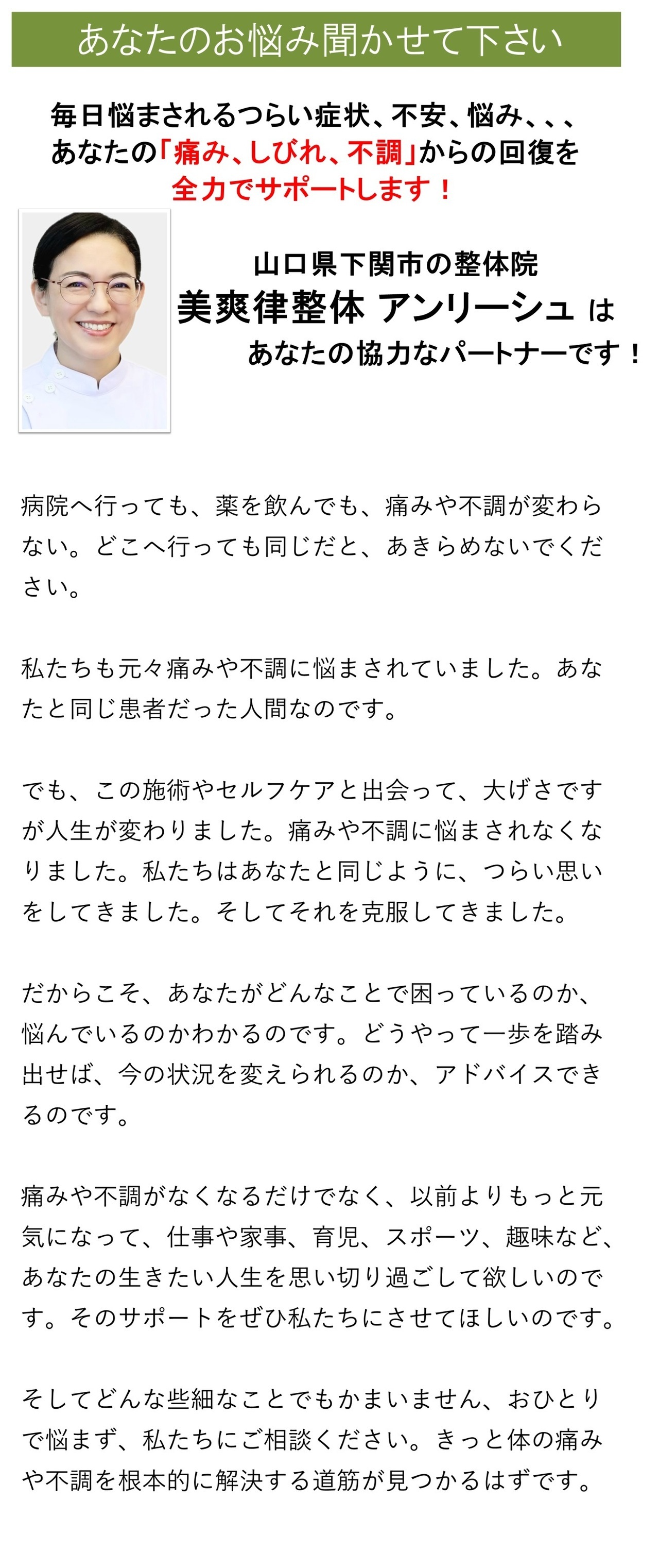 山口県下関市の整体院|痛みと自律神経の専門家。頭痛、肩こり、腰痛、顎関節症、更年期、産前産後          あなたのお悩み聞かせて下さい